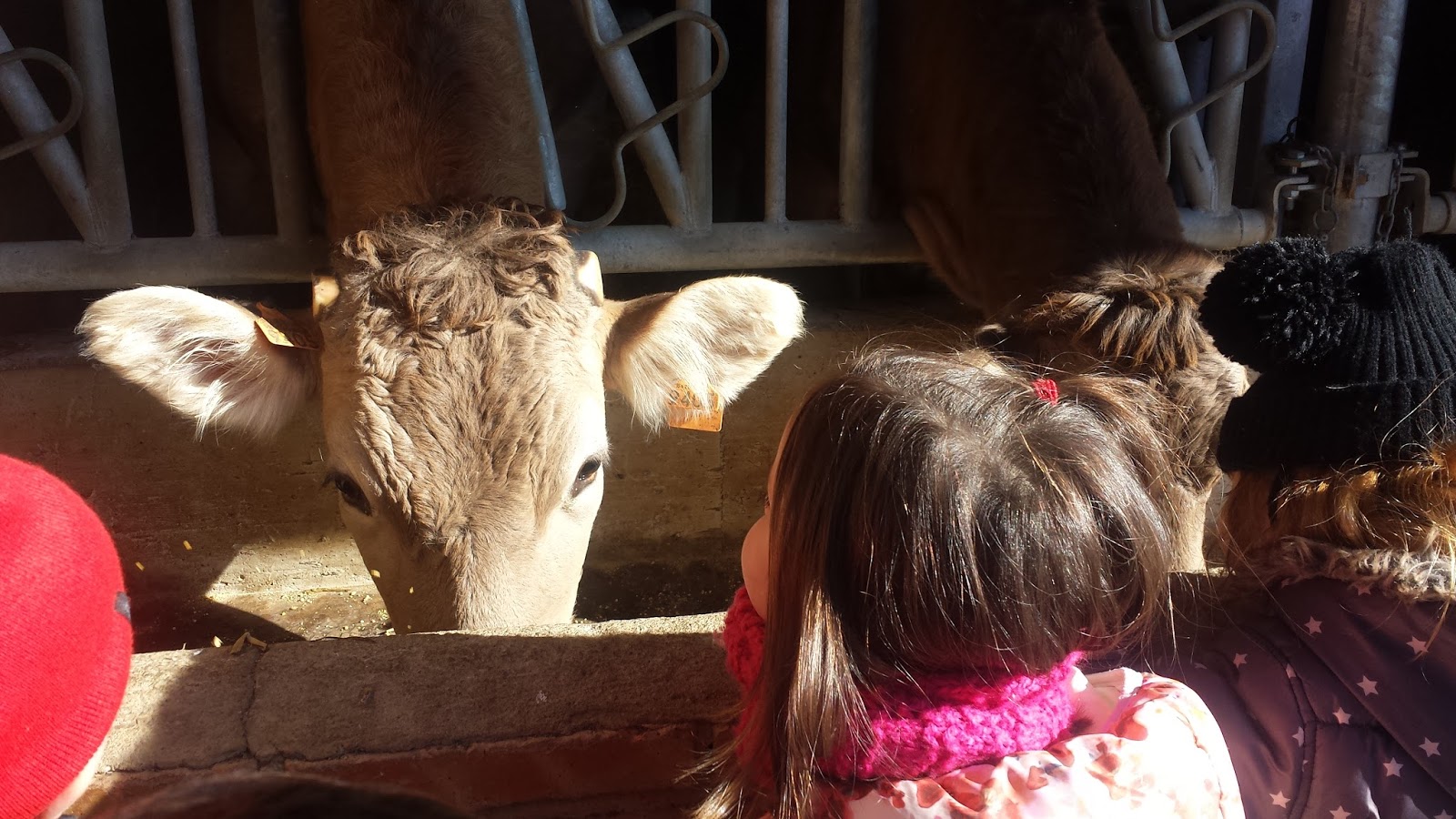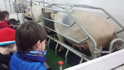 Hemos podido ver muchos animales: vacas, terneros y un toro, ovejas y corderitos, cerdos y lechones, conejos, gallinas, un gallo y huevos.